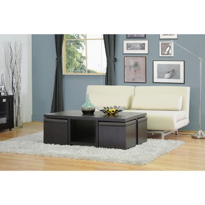 Now your coffee table can be a small dining space with minimal effort. Founded on gleaming legs, this coffee table has two cylindrical ottomans with padded seats slide out from under the table when you need an extra seat. For a very special, very interesting choice in coffee tables, we think you might enjoy a coffee table with seating underneath. Each of them is upholstered in microfibre in a shade of coffee with milk. Includes integrated 4 storage ottomans that perfectly hide under the table.